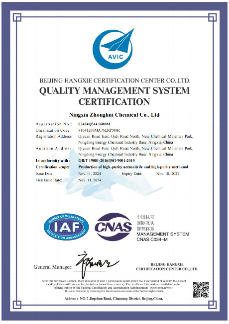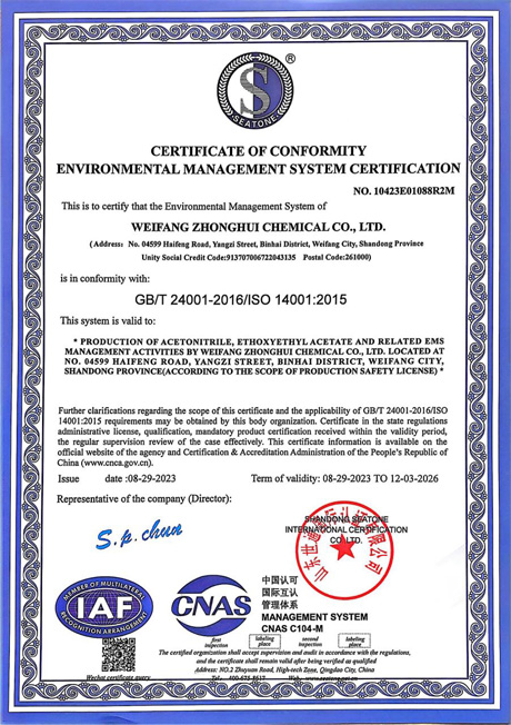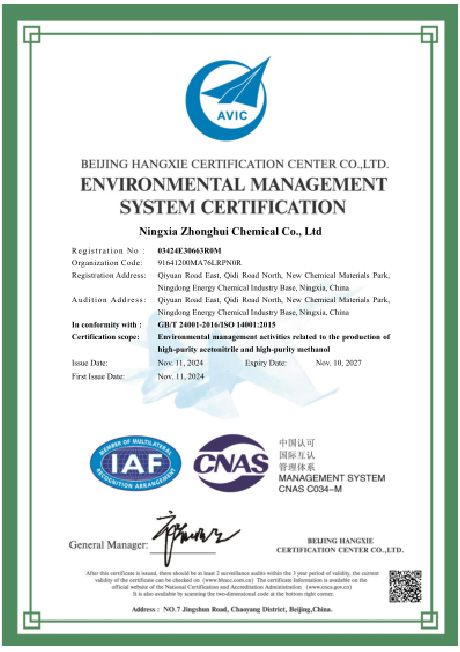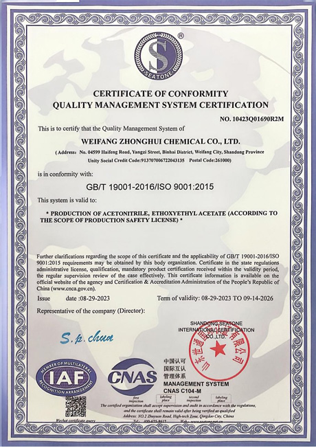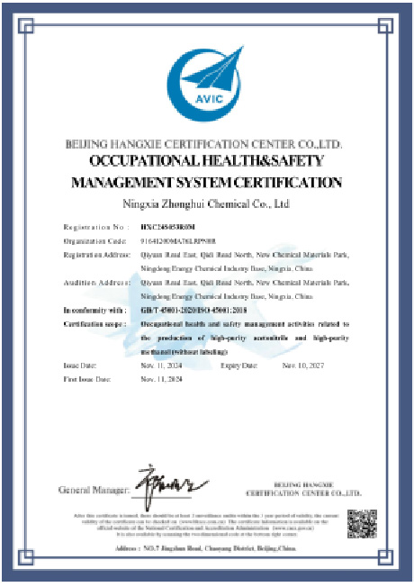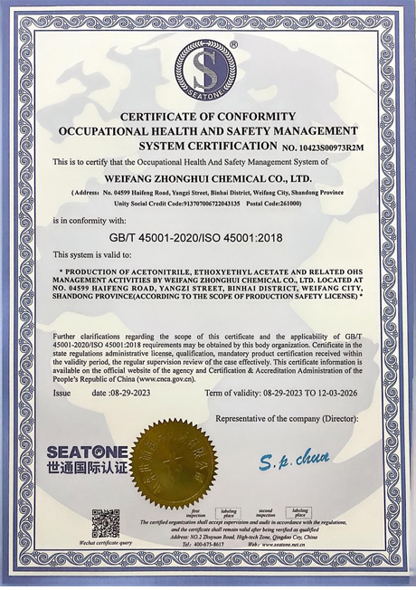 Zhonghui Chemical places great emphasis on system development and has obtained certifications for the Quality Management System (ISO 9001), Environmental Management System (ISO 14001), and Occupational Health and Safety Management System (ISO 45001).